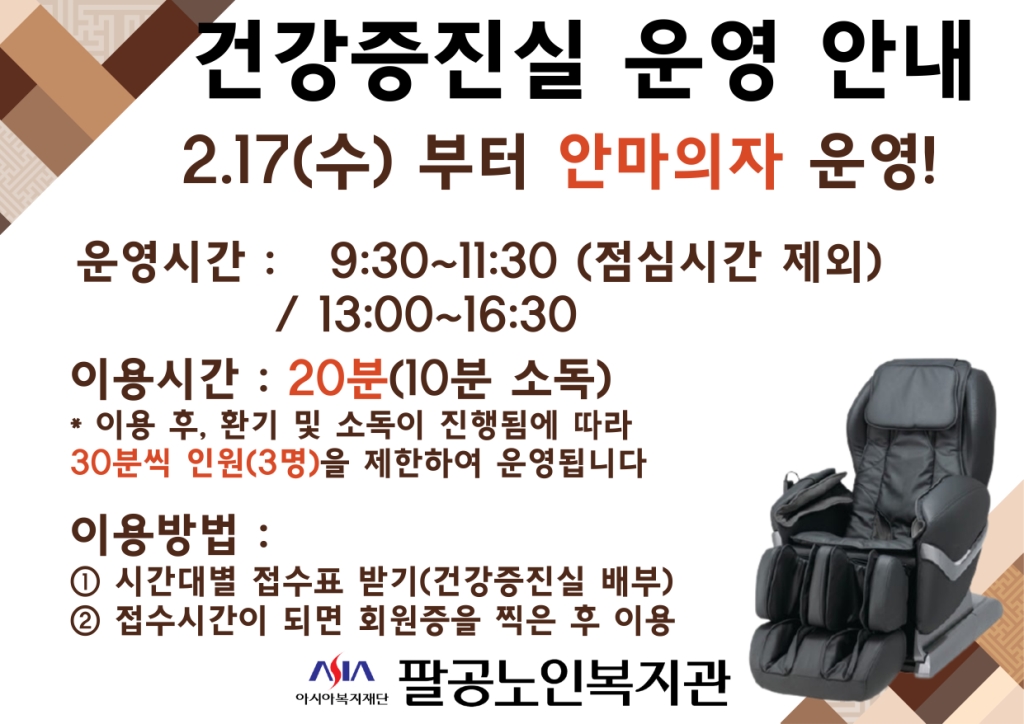 건강증진실 2021. 2. 17.(화)부터 '안마의자' 이용이 가능합니다.